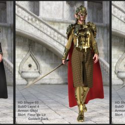 The product includes two new colors for the inner clothes (gold and bronze), two new colors for the outer outfit (shiny gold and black matte with bronze and iron wear). It also includes four new HD morphs for each one of the plate items (a total of 32 new HD morphs) and two new skirt patterns. A set of colors have been added for the inner and the outer surface of the cape.